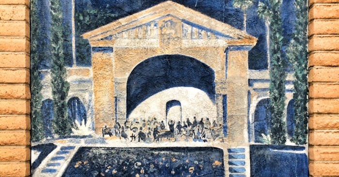 Redlands Bowl Diamond Jubilee was originally a painting done by Fred Cowland to commemorate the 75th year of the Redlands Bowl (1924-1998). Larry Dierdorff turned the art into a mural on the Community Bank building, Cirtus Ave. and 6th St.