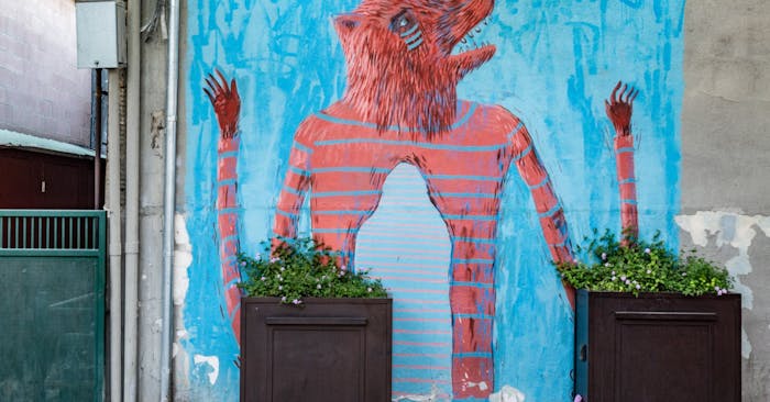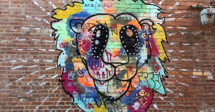 This lion mural is in the Orange St. alley, commonly referred to as Umbrella Alley. The artist behind this piece is Erok the Lion.