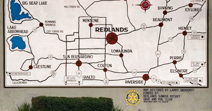 Mural funded by Redlands Sunrise Rotary. Originally designed by Dave and Phil Clem and restored by Larry Dierdorff in 2014. Located at 76 Station on Redlands Blvd.