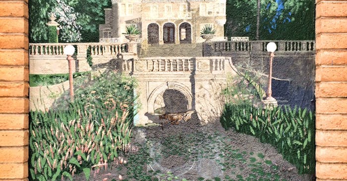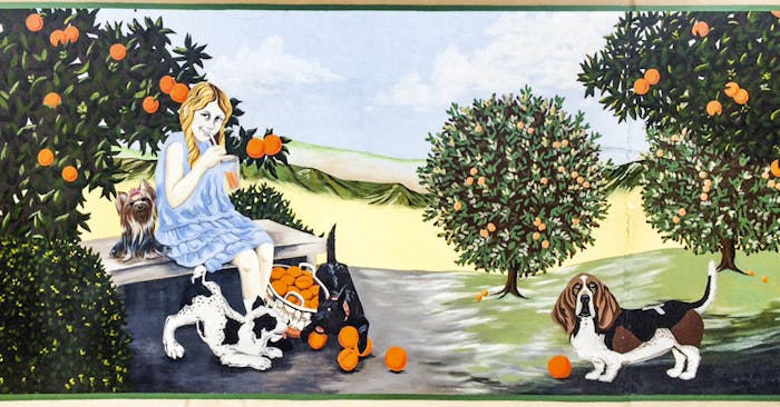 The mural was commissioned by the Downtown Redlands Business Association as part of a project meant to beautify the downtown area. Local artist Emily Mann was given a postcard to recreate on the wall outside Furry Face. The original art was pulled from a 1930s calendar. Even the floating glass was part of the original artwork.