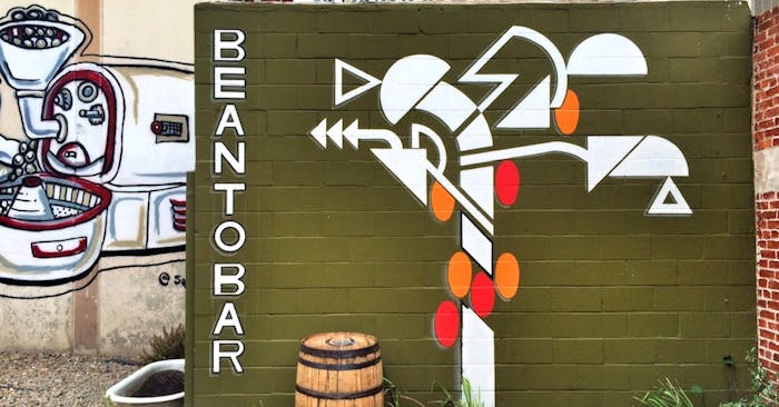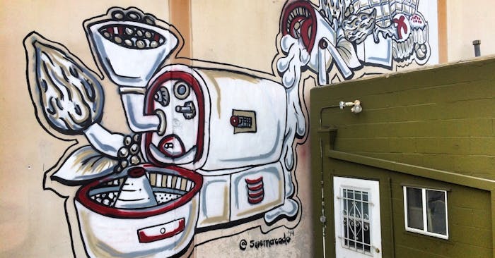 Mural done in 2015 by Marcus Mercado. Located in Parliament Chocolate courtyard on Redlands Blvd.
