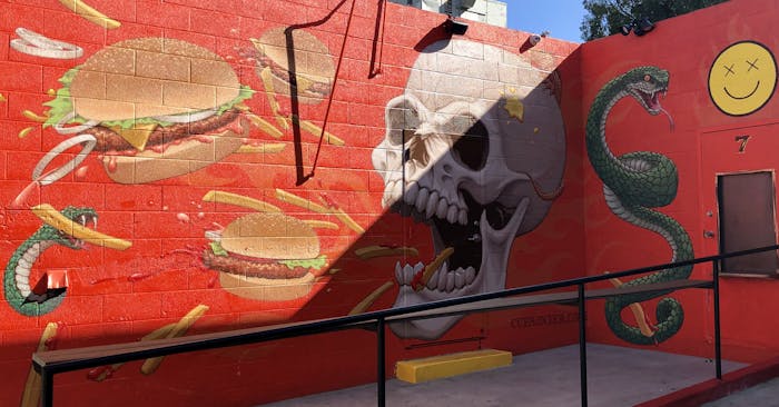 Christine Coates gets edgy with this mural for the new to-go burger restaurant Hate Burger (just opened).