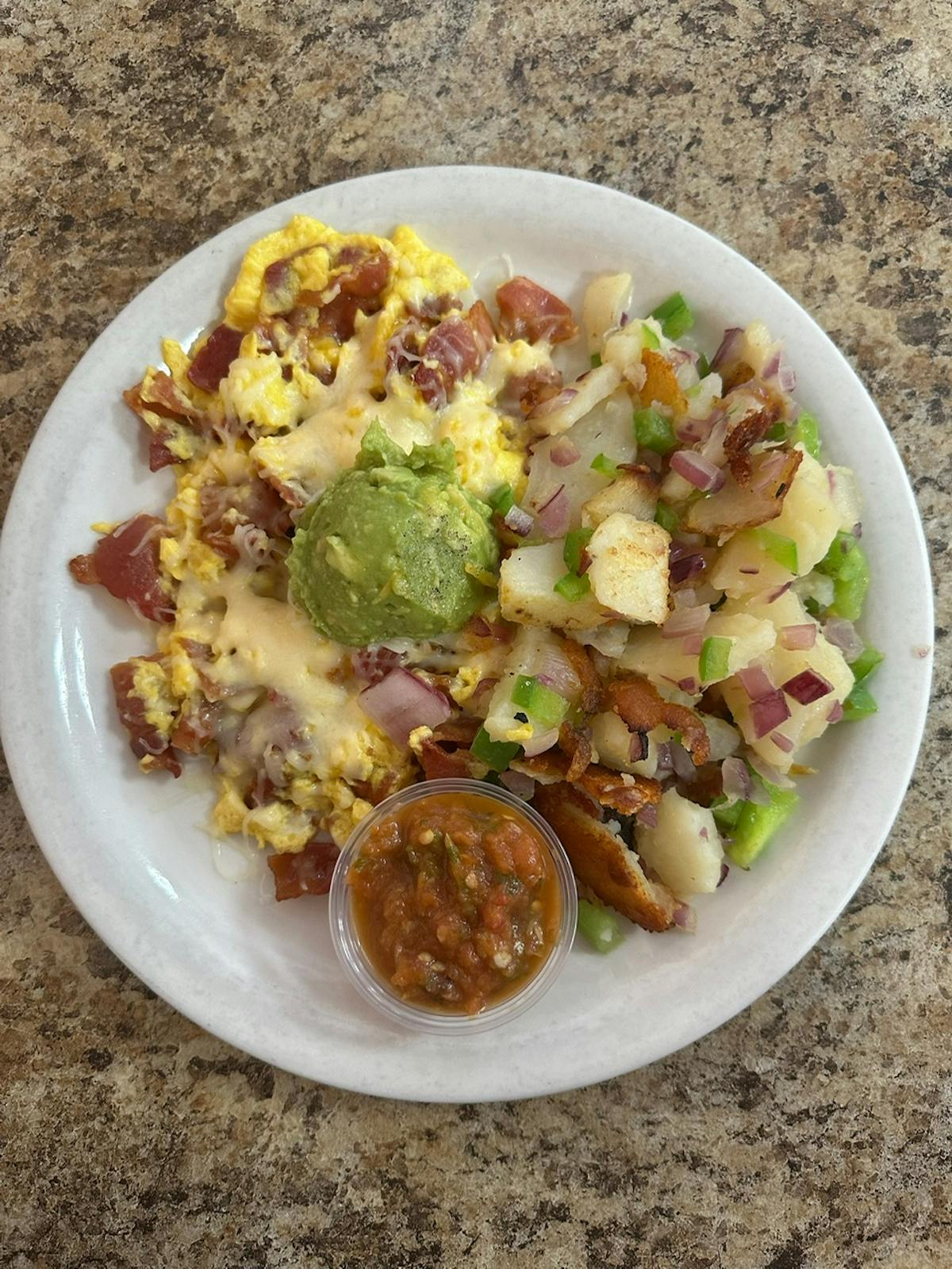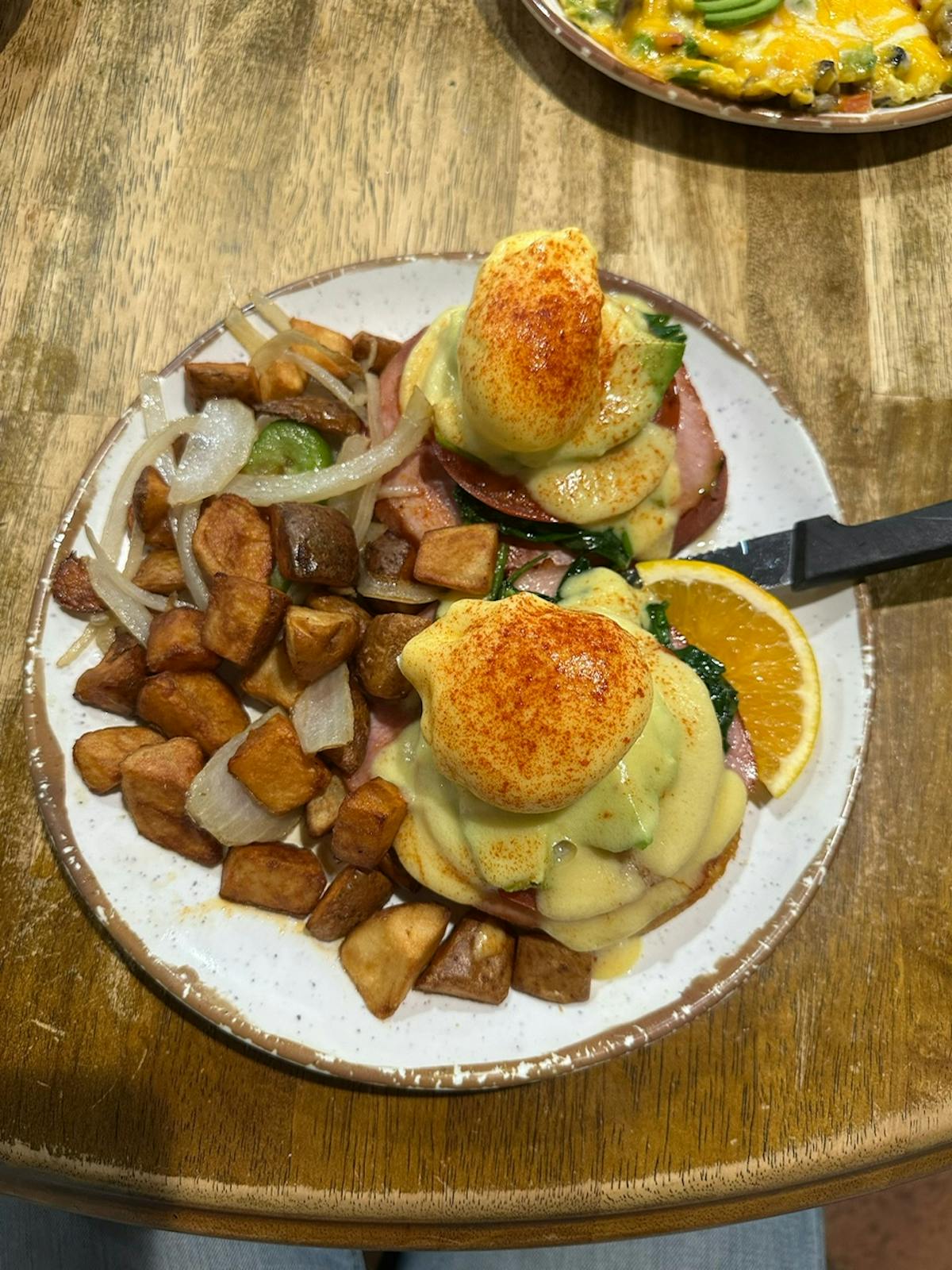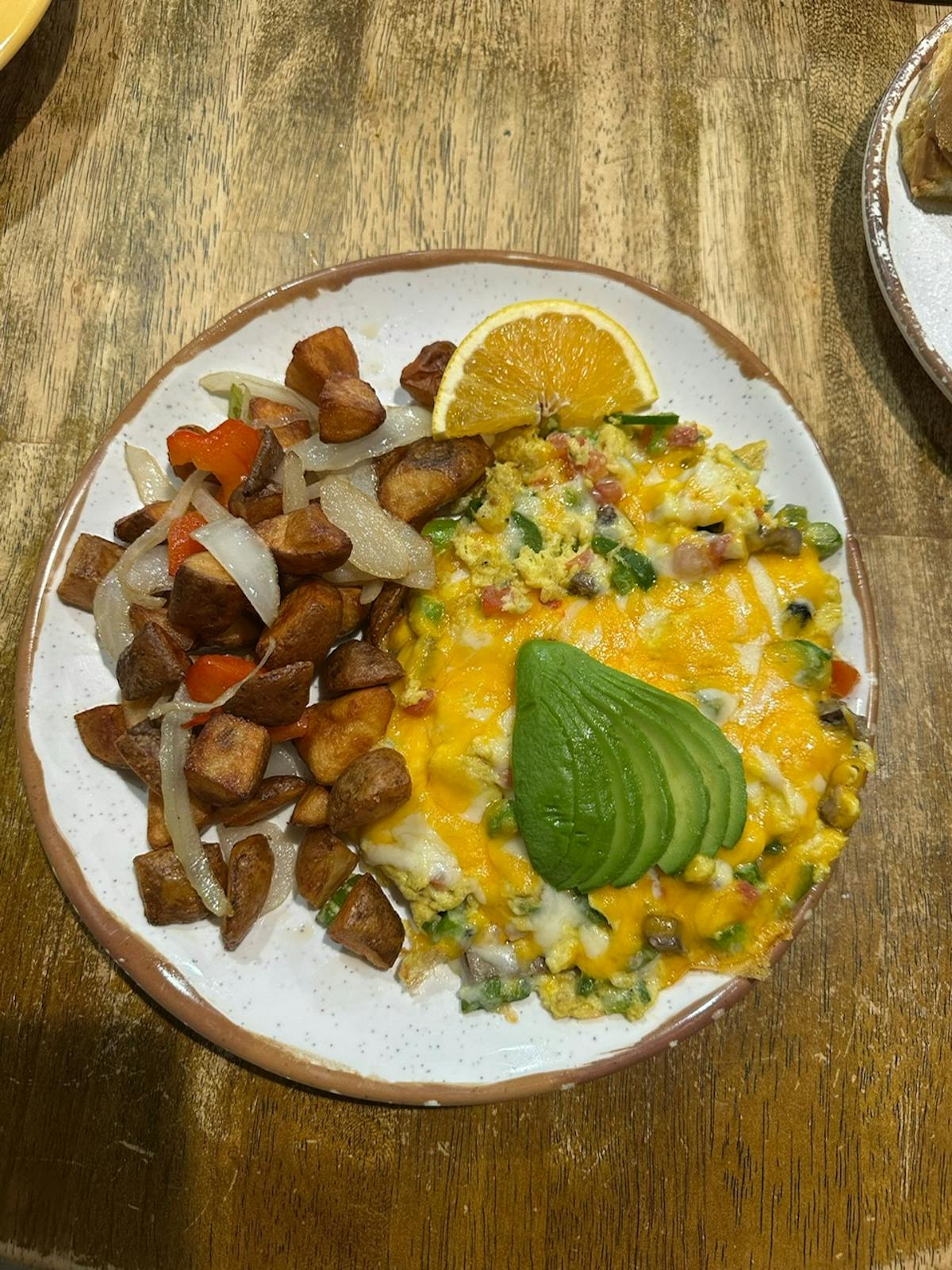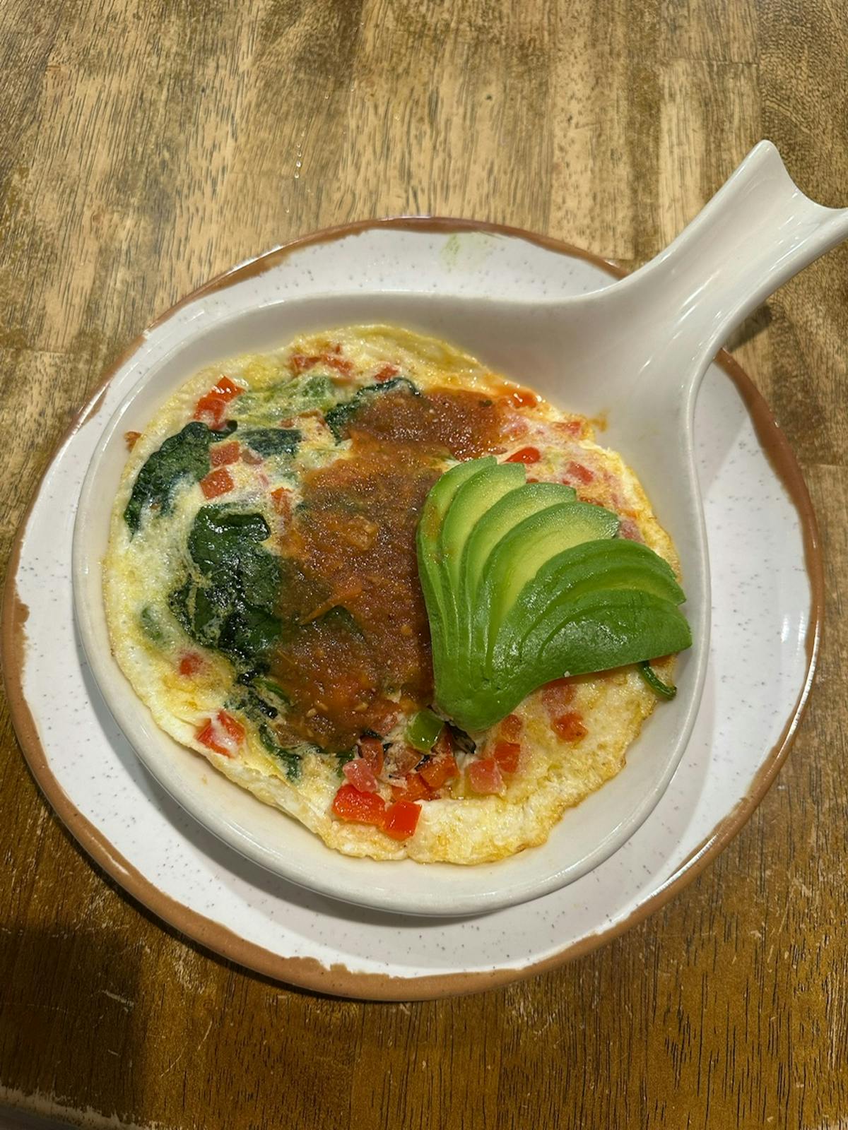 Their suggested pick for us was the Skinny Skillet, which has egg whites, bell pepper, tomato, and spinach, topped with avocado and salsa. Fresh, colorful, and perfect if you want something lighter.