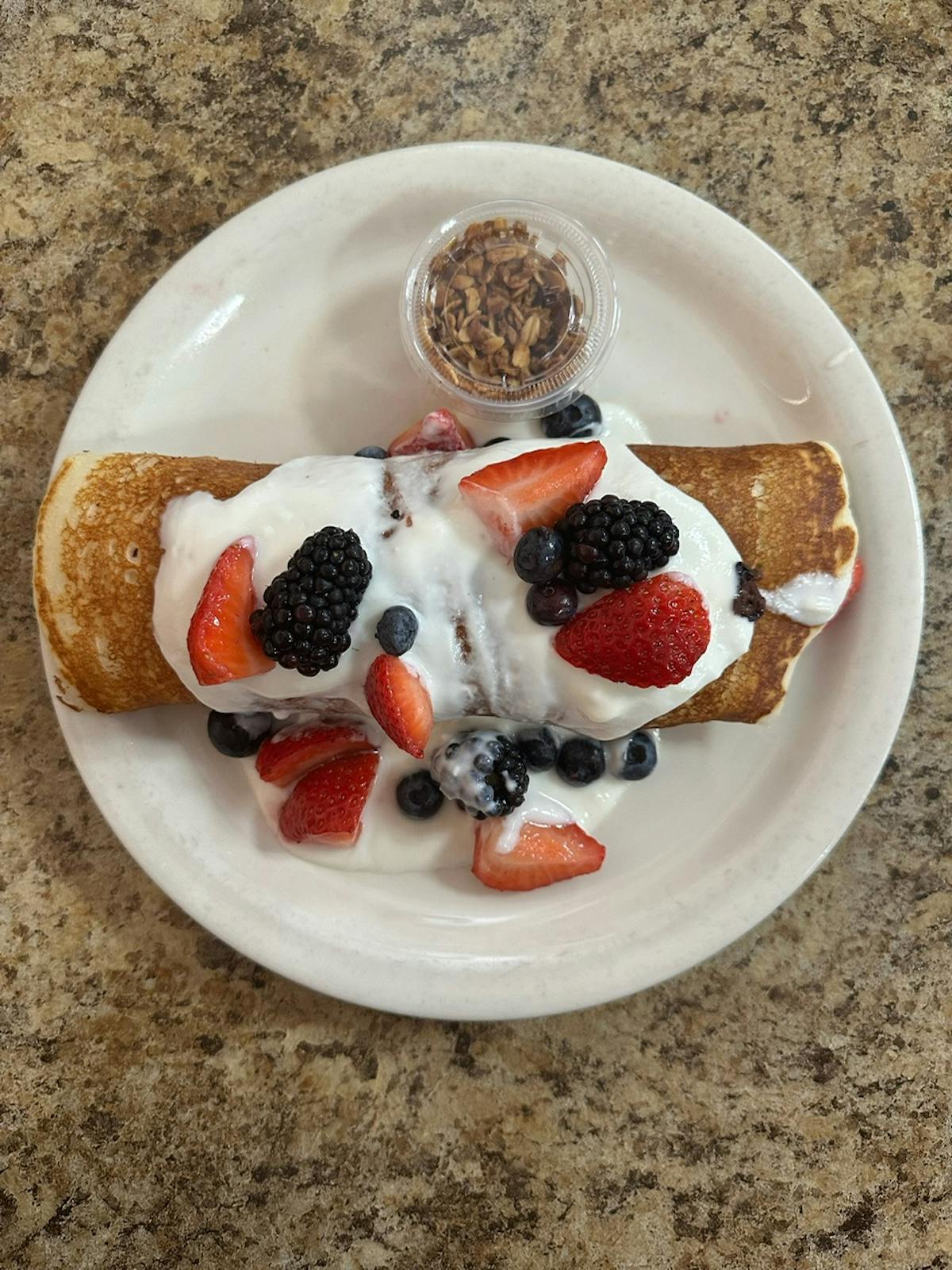 If you lean more toward bold flavors, the Breakfast Enchiladas are a must-try. Two corn tortillas filled with diced chicken breast, covered with mild green salsa, jack cheese, onion, cilantro, and sour cream, and served with eggs any style, plus your choice of side: beans, country potatoes, hash browns, or fruit. It’s a full plate, and worth every bite. For something lighter but still indulgent, we had the Strawberry Pancake Roll that delighted us. A giant buttermilk pancake wrapped around vanilla yogurt and fresh berries, topped with more yogurt, berries, and homemade granola. It’s refreshing, sweet, and feels a little like dessert disguised as breakfast.