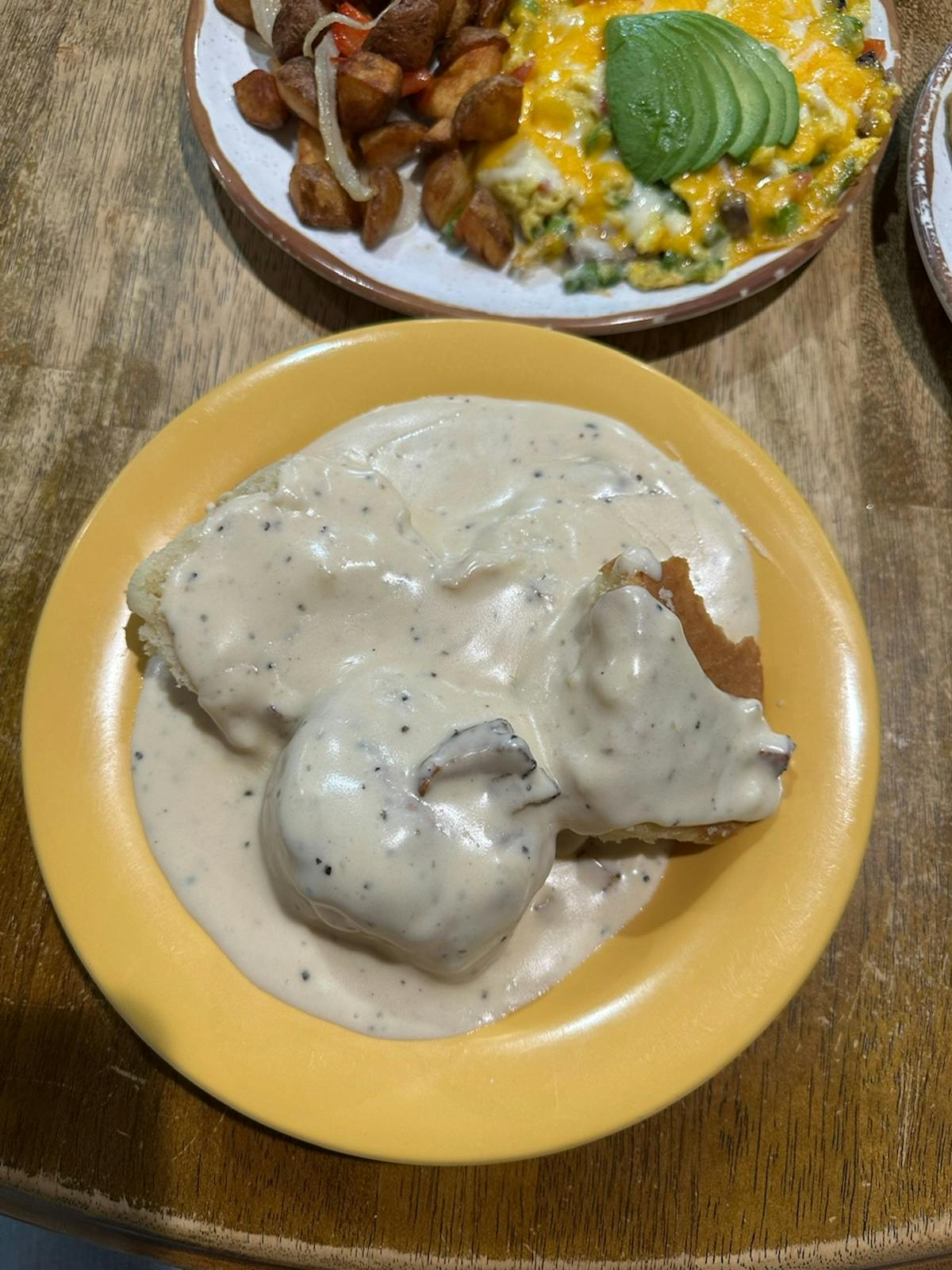 For a more indulgent route, you can’t miss the Elvis Special, a local favorite: French toast stuffed with peanut butter and banana, served with fresh fruit. It’s exactly the kind of fun, nostalgic breakfast that Martha Green’s is known for. Here are a few of the other items we shared: SoCal Breakfast Scramble (pro tip: add chorizo), Biscuits and Gravy (a classic), Cinnamon French Toast made with their own bakery bread, and The Bomb-Benedict, a customizable twist on the classic.