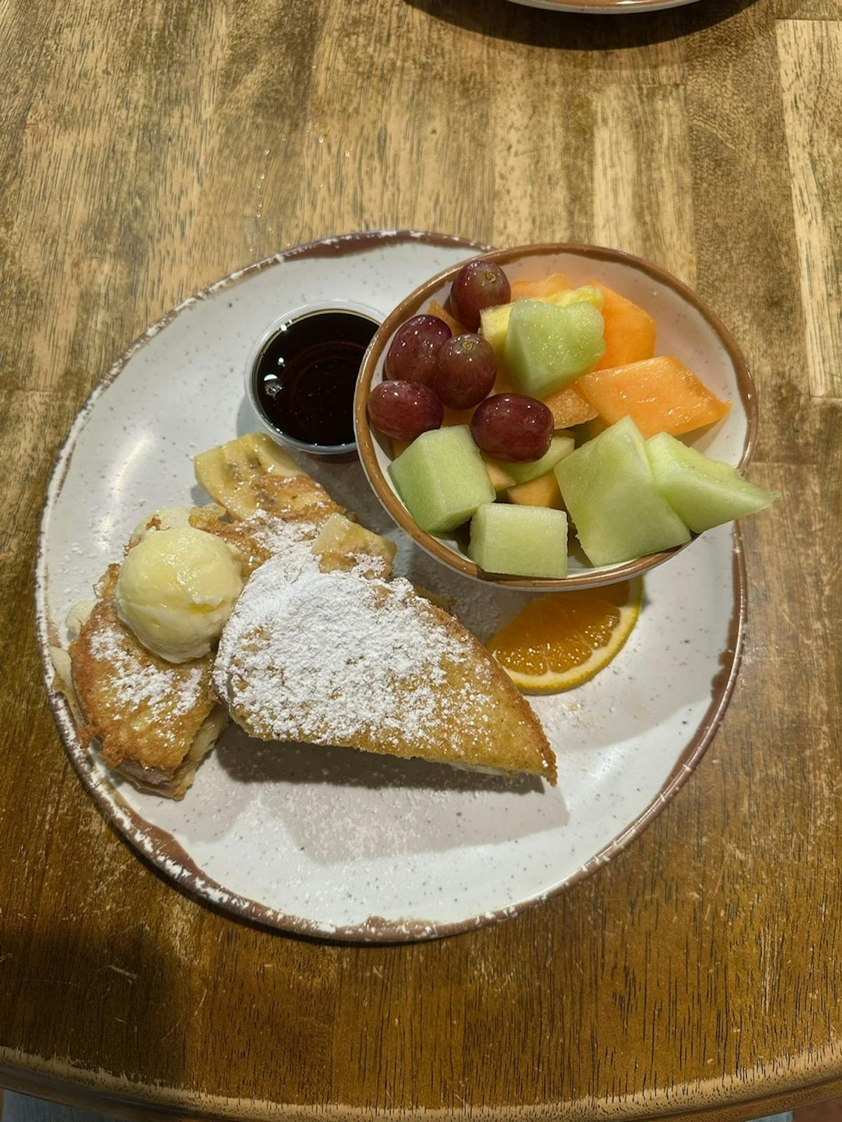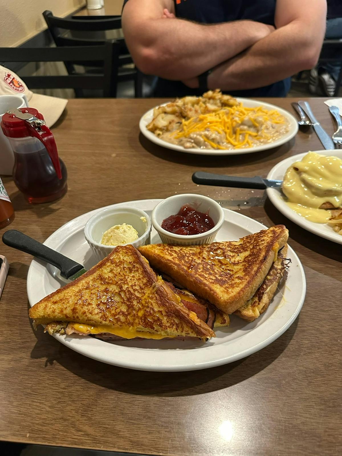 Then came a standout we couldn’t stop talking about ( and Ian’s favorite): McDuff’s Cristo. Thick-cut French toast layered with fresh country ham and cheddar cheese, served sandwich-style with whipped butter and strawberry jam on the side. Sweet, savory, and indulgent in the best way. This one feels like a must-order, especially if you’re in the mood for something a little extra.