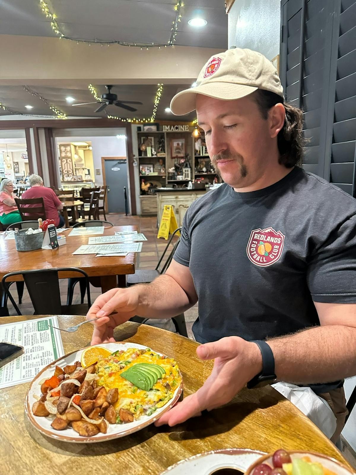 Keith suggested we start big with the smothered breakfast burrito, done half-and-half with country gravy and their hot green salsa. Truly the best of both worlds. His sweet pick? The crunchy French toast that hits the perfect spot between crispy and comforting. We also enjoyed the California Scramble: three eggs mixed with crispy bacon, topped with melted Jack cheese and ripe avocado, with salsa on the side. Simple, filling, and exactly what you want on a slow Redlands morning.