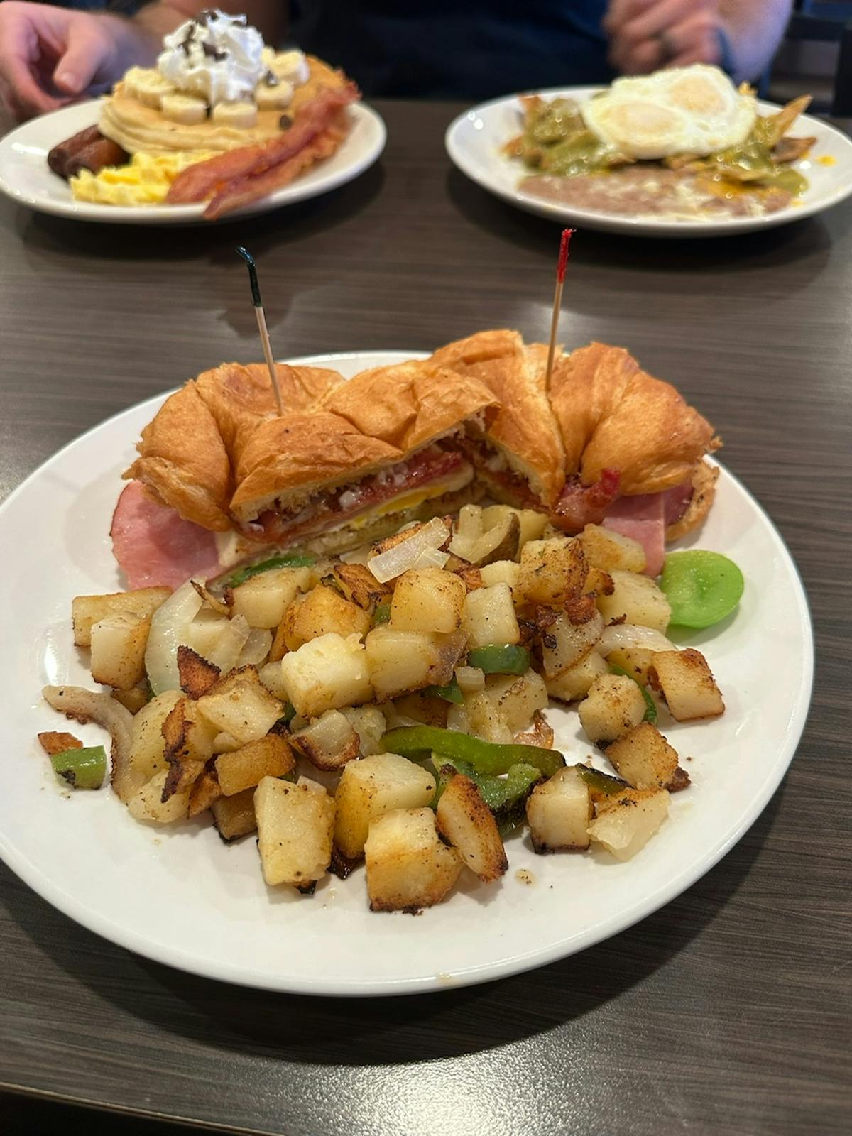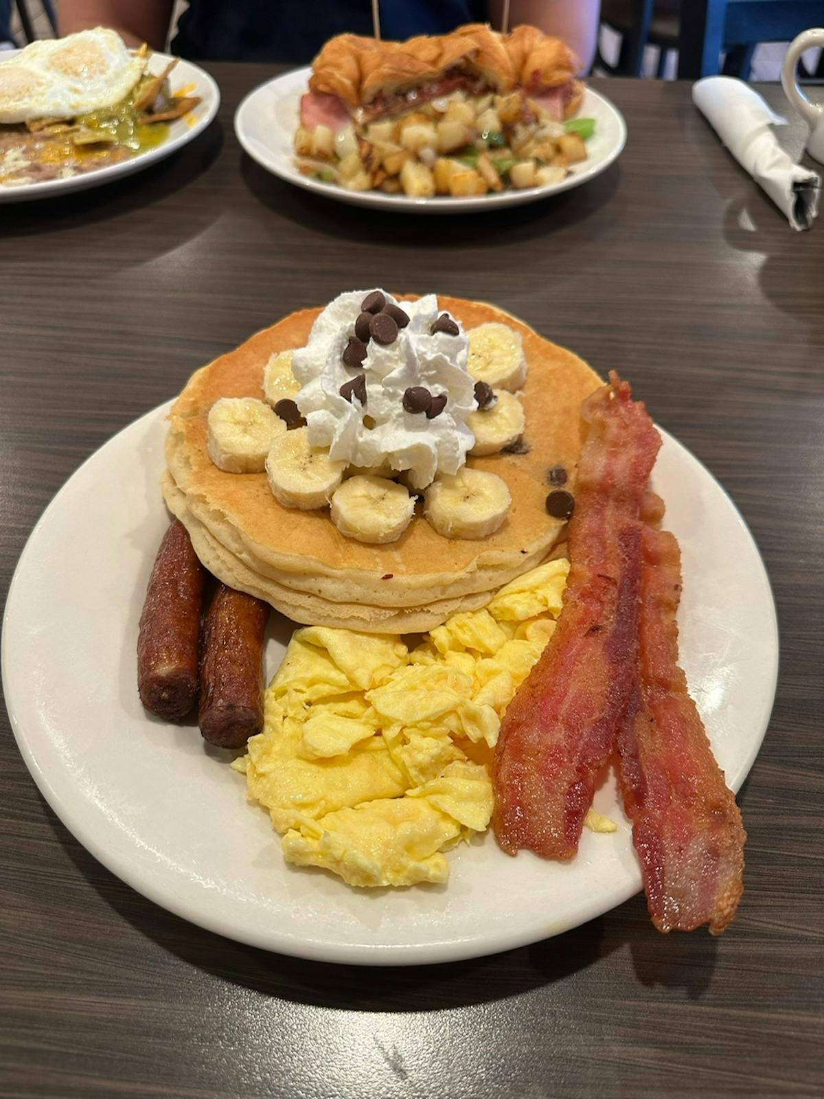 that featured deep-fried chips smothered in spicy pork, green sauce, topped with two eggs, cheddar, pepper jack cheese, and served with beans. Bold, spicy, and exactly the kind of plate that wakes you right up. Next up is the Breakfast Croissant Sandwich filled with sliced ham layered with crispy bacon, two over-hard eggs, and Swiss cheese inside a buttery croissant. It comes with your choice of potatoes and hits that perfect savory-satisfying morning spot. For “dessert” we enjoyed the Choconana Pancake Combo (Special) that was two chocolate chip pancakes topped with fresh banana, plus two eggs, two sausages, and two bacon. A sweet tooth’s dream with a classic breakfast combo on the side.