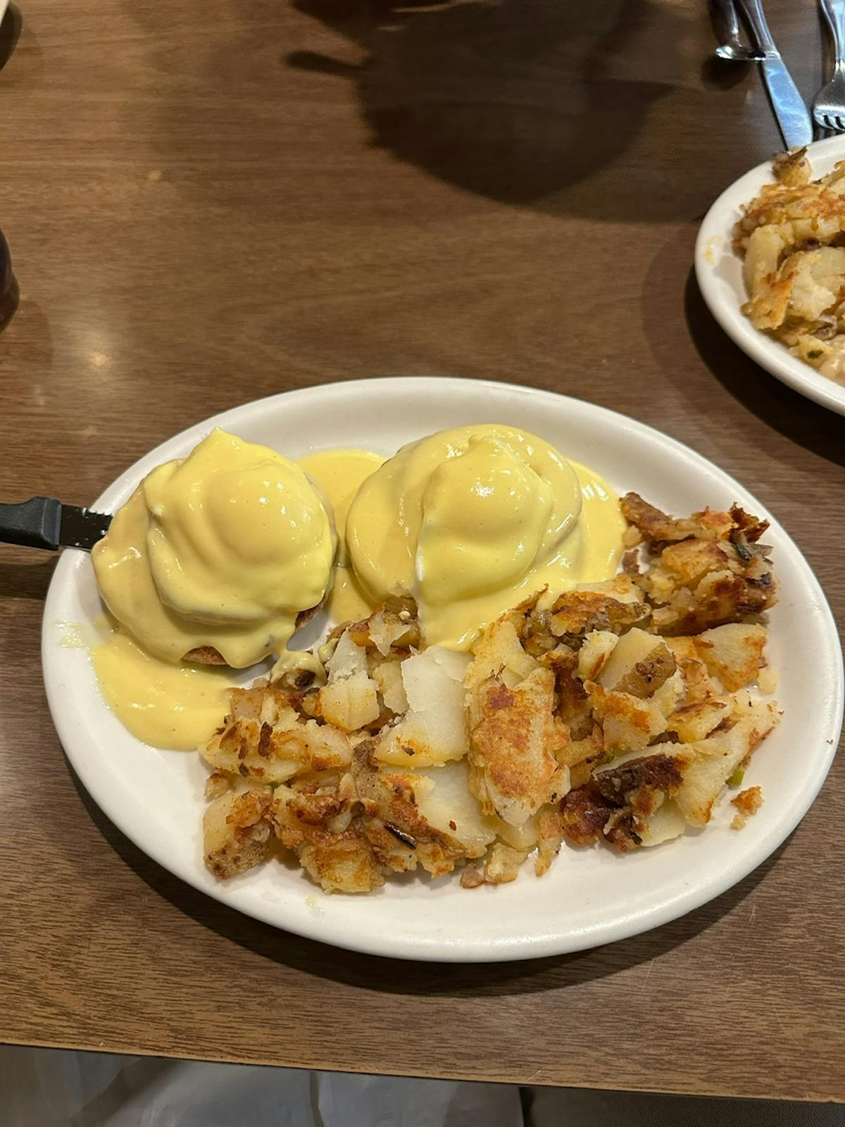 Next up was the Eggs Benedict, a timeless favorite done just right. A toasted English muffin topped with Canadian bacon, two poached eggs, and silky hollandaise sauce, again served with those dependable home fries. It’s a classic for a reason, and McDuff’s doesn’t overthink it, they simply nail it.