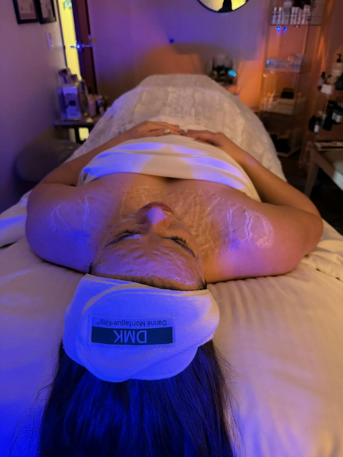 I got to experience her DMK enzyme therapy facial firsthand and cannot recommend it enough. Starting with Enzyme Level 1, designed to bring blood flow to the surface for healing and improved circulation, treatments progress into muscle-banding techniques using layered enzymes to tighten, calm redness, and stimulate deep repair.